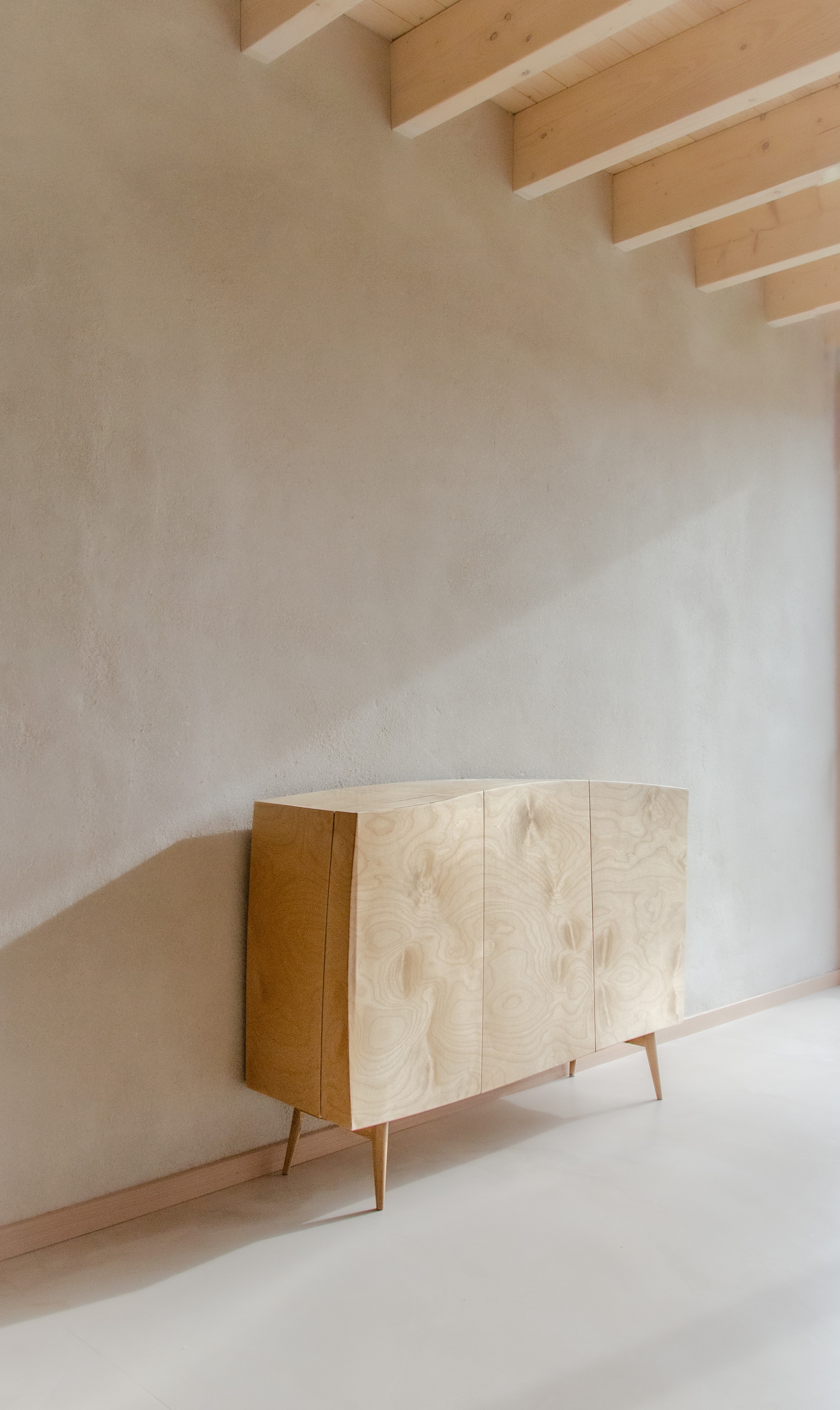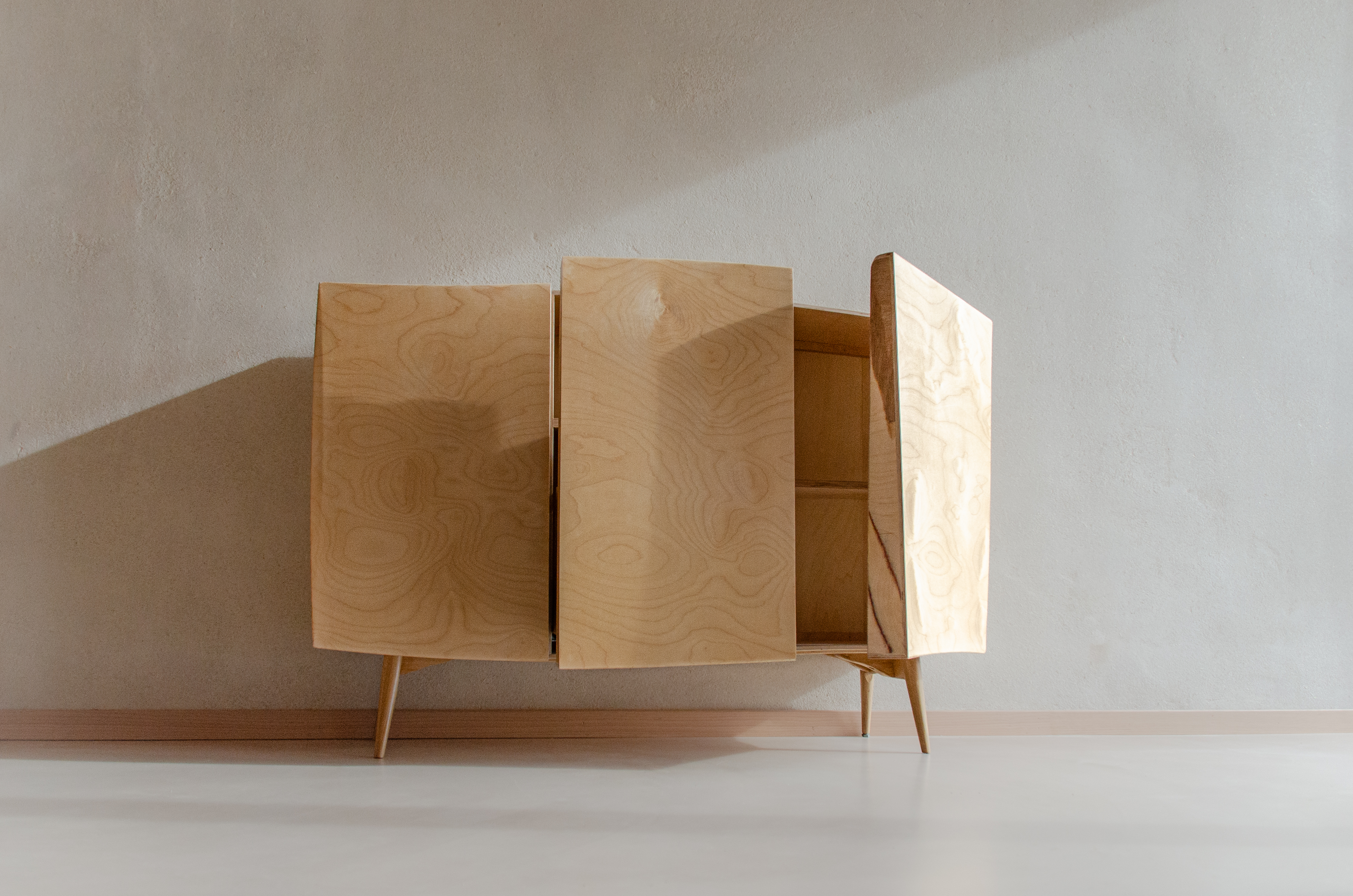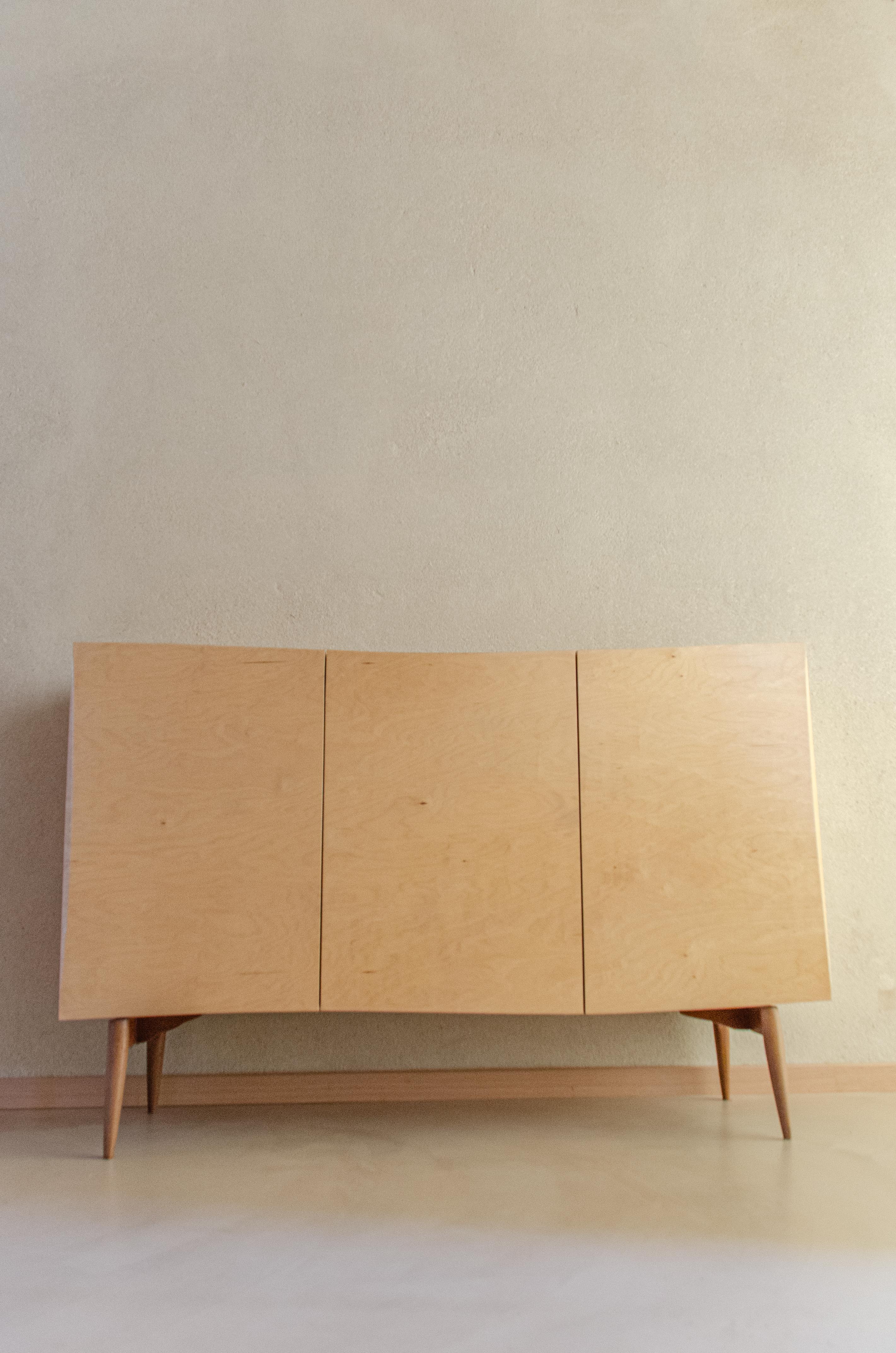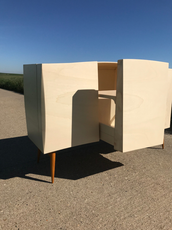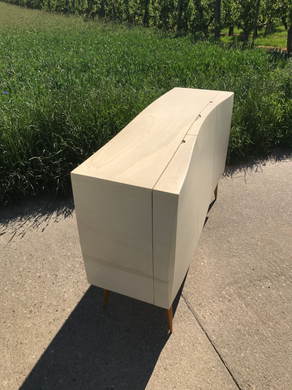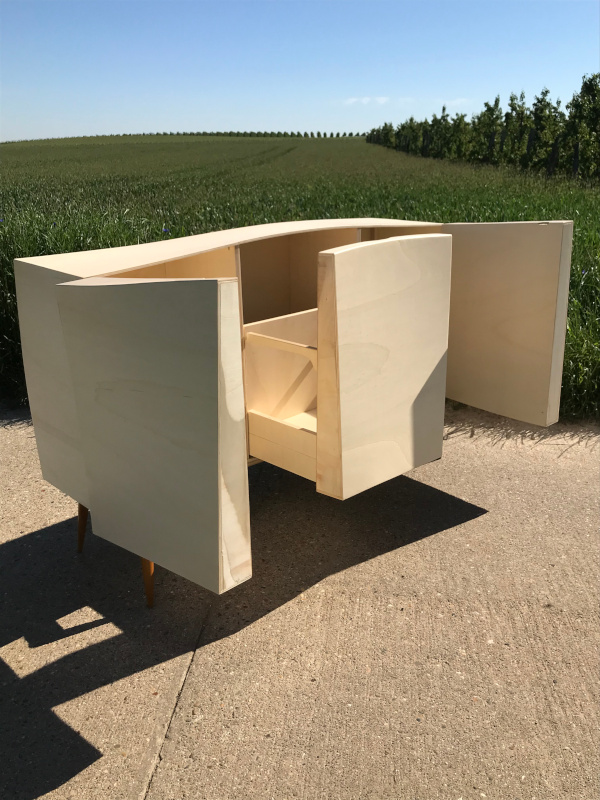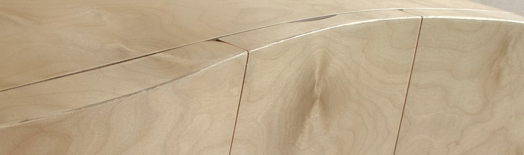 In een vakantie ontwikkelde ik een protocol voor een erg innovatief constructie concept waarbij de kast geplooid wordt rond het binnenwerk. Omdat de multiplex meerlagig is wordt de druk bij het buigen gelijkmatig verdeeld en ontstaat er door de opgelegde spanning een erg gestroomlijnde vorm die in principe telkens uniek is. Links, rechts, boven, onder, aan de buitenkant van de kast ‘vloeit’ het hout als een golf zeewater. Vandaar ook de naam van de reeks ‘Tidal’…