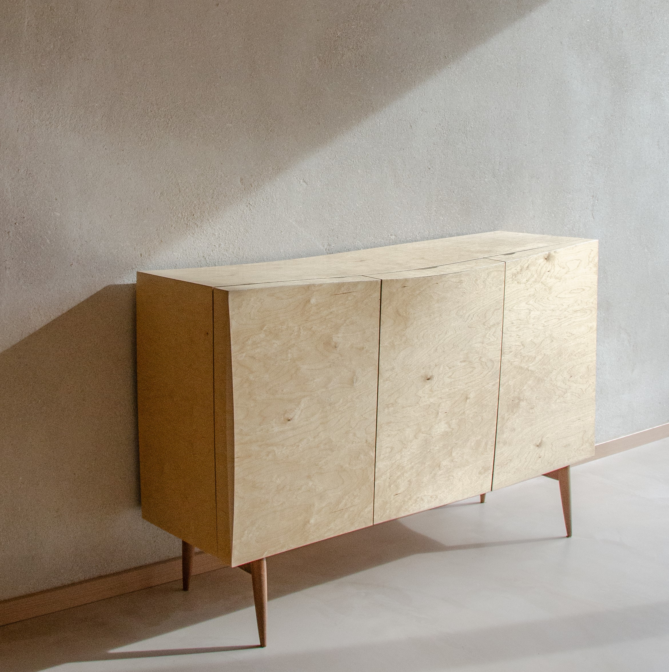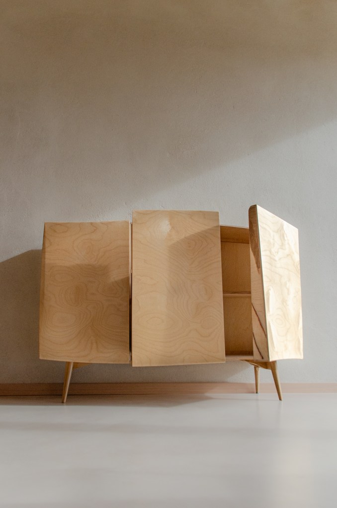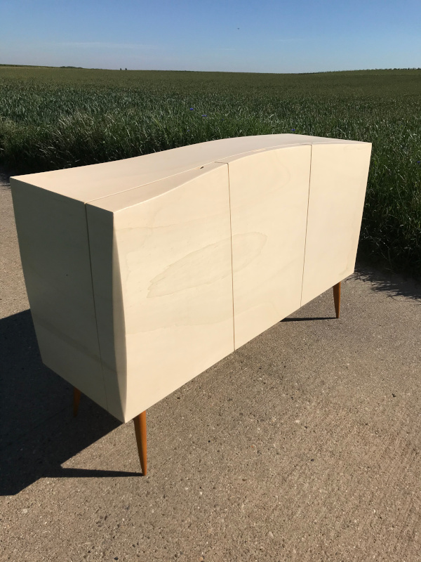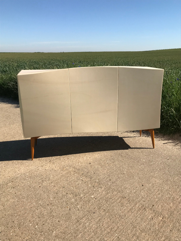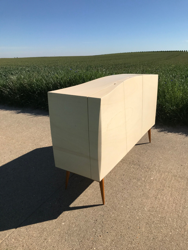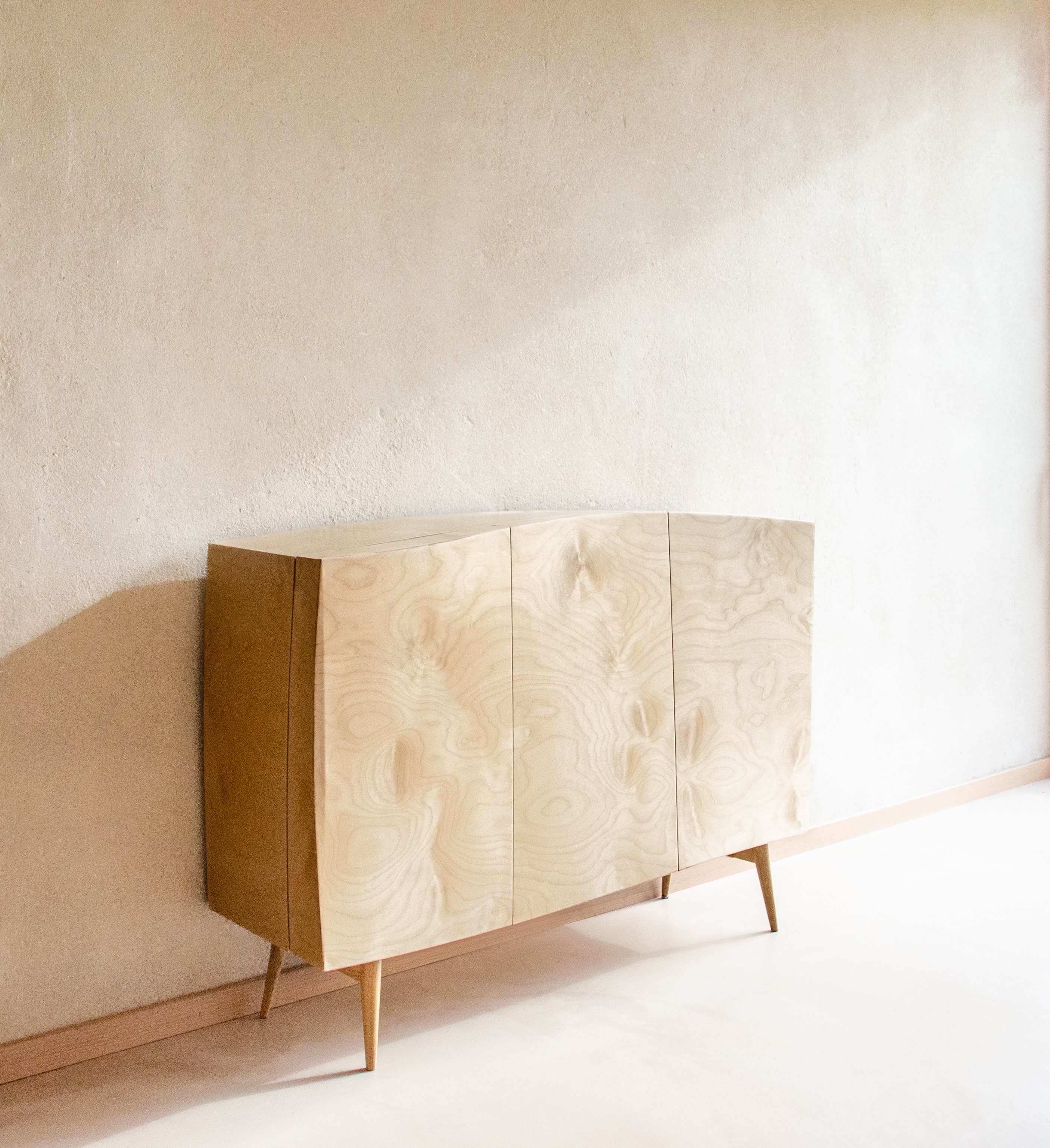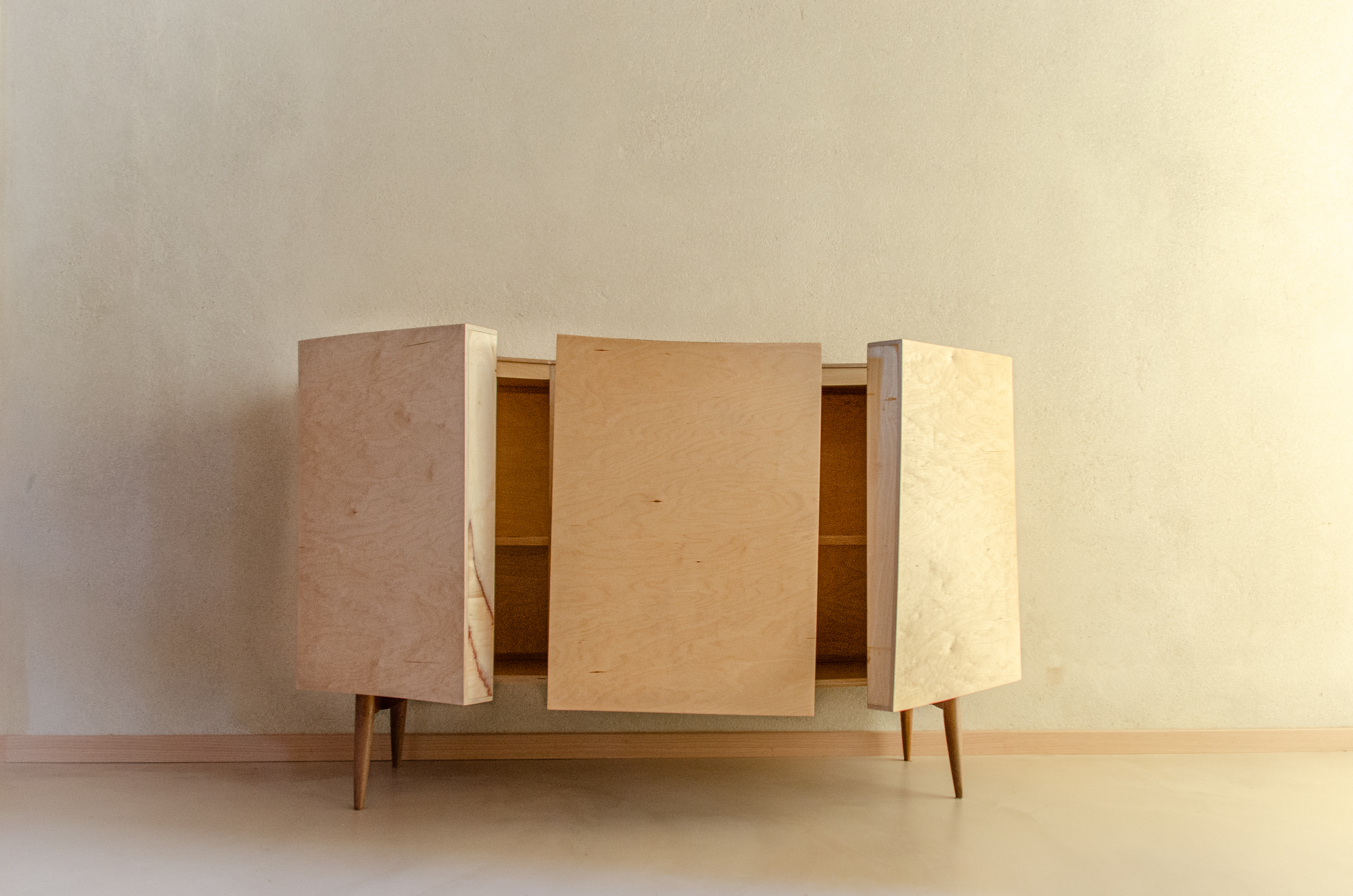 In een vakantie ontwikkelde ik een protocol voor een erg innovatief constructie concept waarbij de kast geplooid wordt rond het binnenwerk. Omdat de multiplex meerlagig is wordt de druk bij het buigen gelijkmatig verdeeld en ontstaat er door de opgelegde spanning een erg gestroomlijnde vorm die in principe telkens uniek is. Links, rechts, boven, onder, aan de buitenkant van de kast ‘vloeit’ het hout als een golf zeewater. Vandaar ook de naam van de reeks ‘Tidal’…