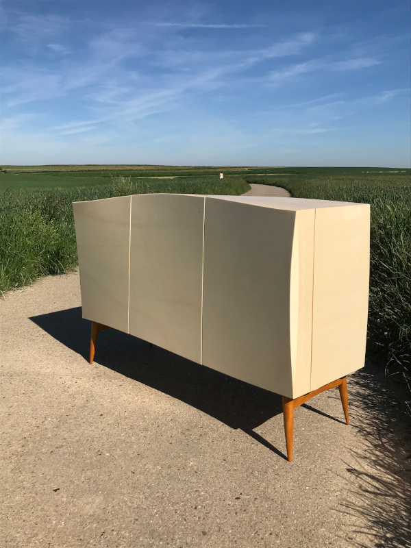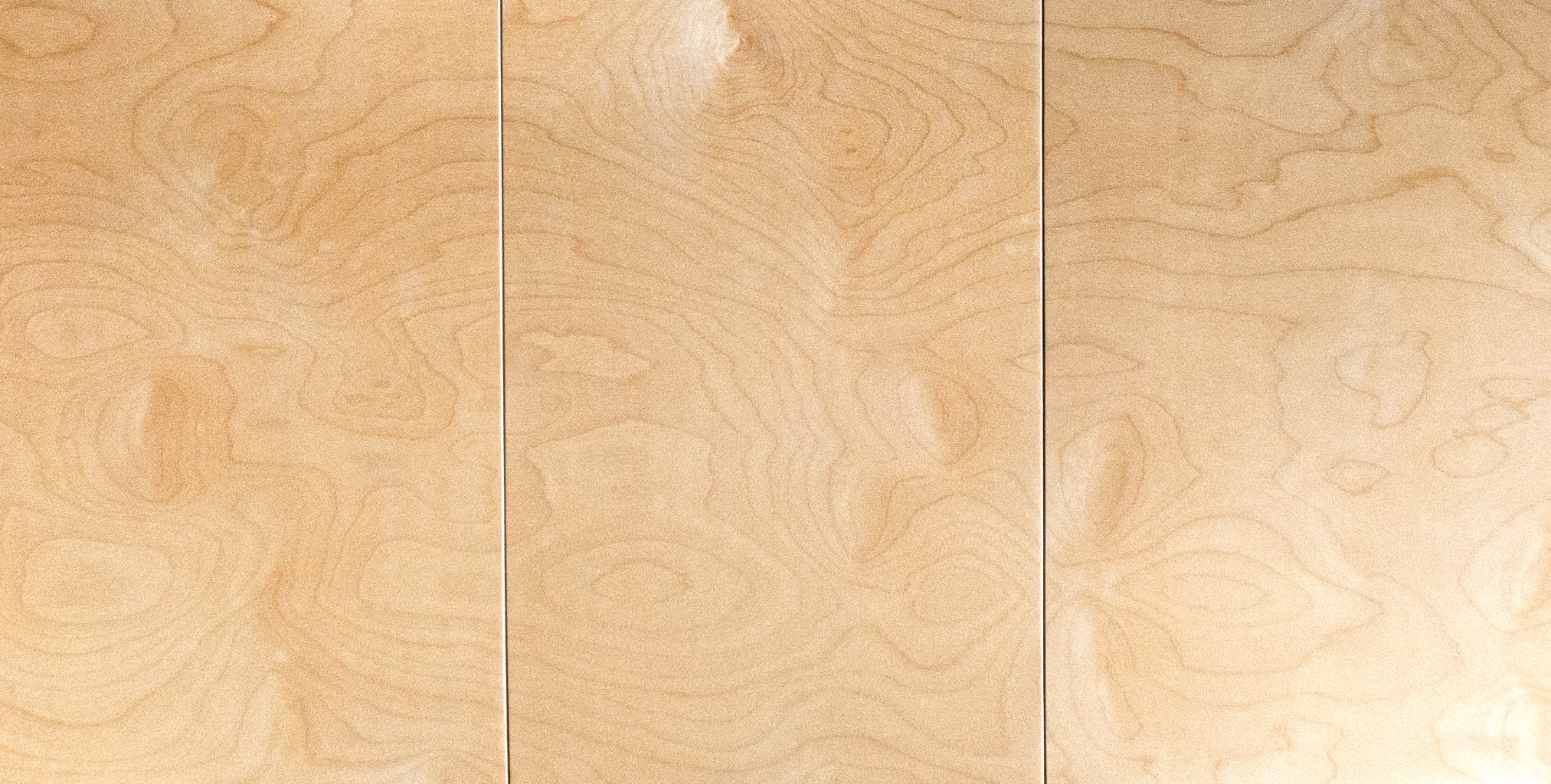 De fineer is van de boom ‘gerold’ en heeft daardoor een ononderbroken tekening. Deze manier van fineer winnen wordt slechts op enkele houtsoorten toegepast; populier en berk zijn daarvan twee erg bruikbare soorten. Populier met zijn zachte tekening over de nerven heen en fruitige kleuren die per plaat erg kunnen verschillen van zeer zacht tot wild en erg kleurig met roze en blauw-groene tinten. Berk heeft dan weer een meer uitgesproken nerftekening en speelt vaak met wildere spiegels die van het hout, meer nog dan bij populier, een hoofdrolspeler maakt. Daarom selecteer ik ter plaatse in de houthandel welke plaat ik precies moet hebben.