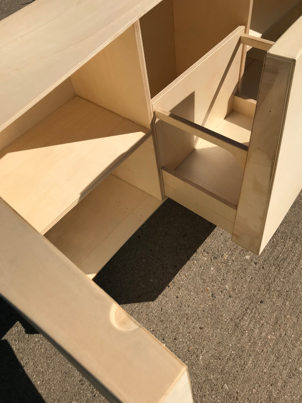 berk multiplex, 40 cm diep, 87 cm hoog, 138 cm breed, 156 cm breed met deuren open.